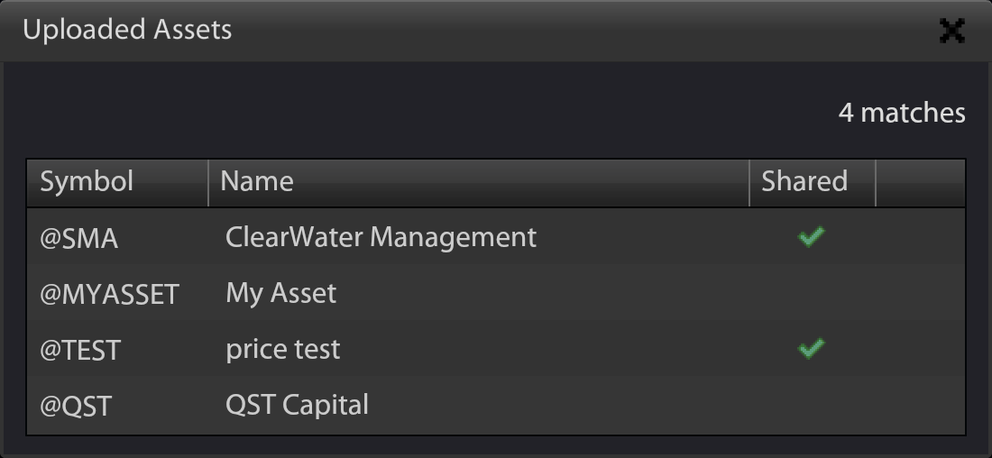 To share an imported asset with other advisors, use the ‘Shared’ setting in the list of uploaded assets:
